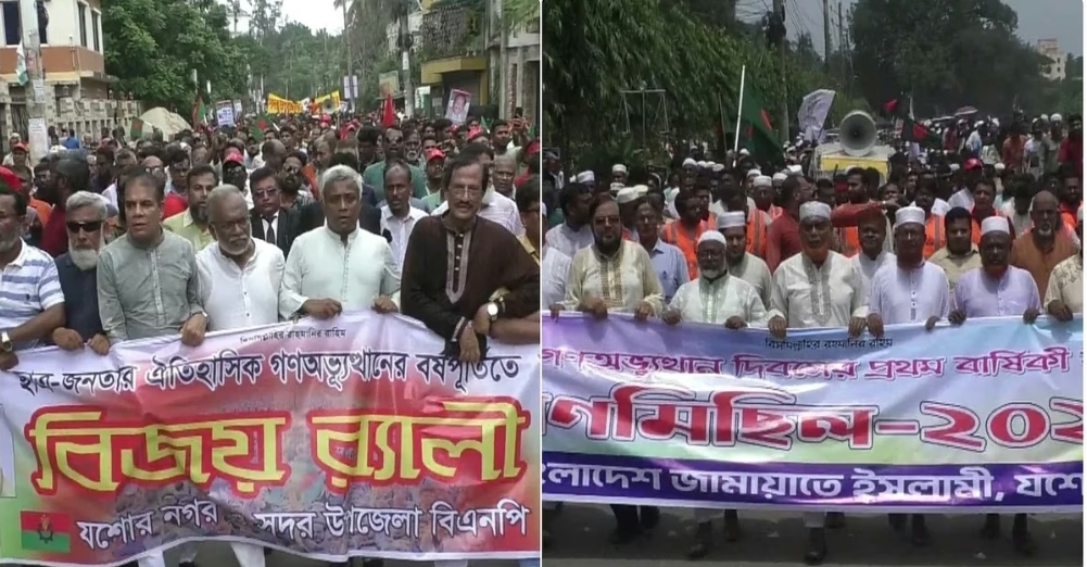 জুলাই মাসের গণ–অভ্যুত্থানের বর্ষপূর্তি উপলক্ষে যশোরে পাশাপাশি স্থানে একই সময়ে সমাবেশ ও বিজয় মিছিল করেছে বিএনপি ও জামায়াতে ইসলামী। শহরের দুই প্রান্তে বড় দুটি মিছিলের কারণে সড়কে তীব্র যানজট তৈরি হয়ে ভোগান্তিতে পড়েন সাধারণ মানুষ।