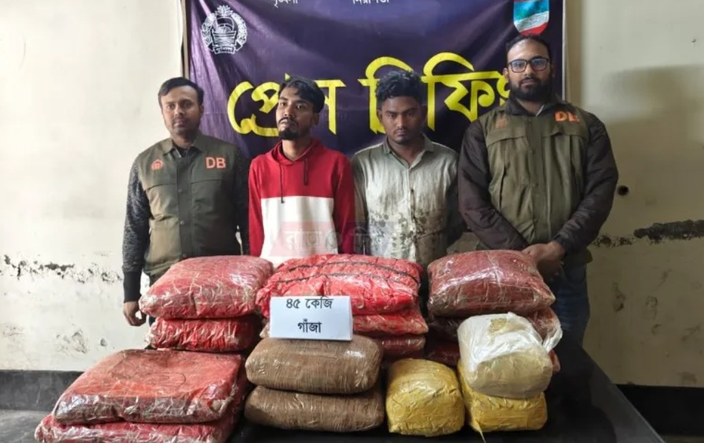 ডিবি পুলিশ জানায়, গোপন সংবাদের ভিত্তিতে সোমবার সকালে যশোর শহরতলীর খয়েরতলা ট্রাস্ট ফিলিং স্টেশনের সামনে ঢাকা মেট্রো-ন ১২-৪৪৮২ নম্বরের একটি বাসাবাড়ির মালামালবোঝাই মিনি পিকআপ থামিয়ে তল্লাশি করা হয়। তল্লাশির একপর্যায়ে পিকআপের ভেতরে থাকা একটি খাটের মধ্যে লুকিয়ে রাখা একটি বস্তা জব্দ করা হয়। পরে বস্তাটি খুলে ৪৫ কেজি গাঁজা উদ্ধার করা হয়। ঘটনাস্থল থেকেই দুইজনকে আটক করে পুলিশ।